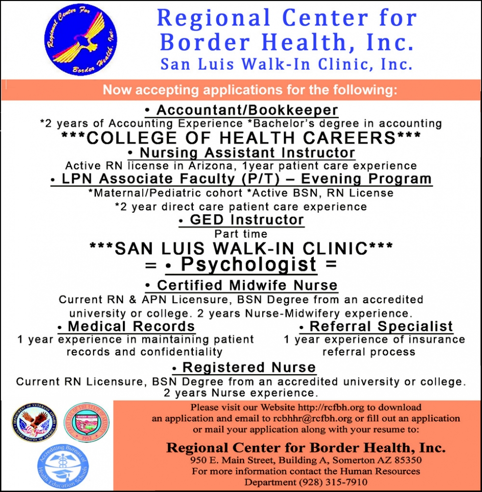 Oct 26, 2025. Regional Center for Border Health, Inc Healthcare/ Dental Jobs from Yuma Sun Jobs