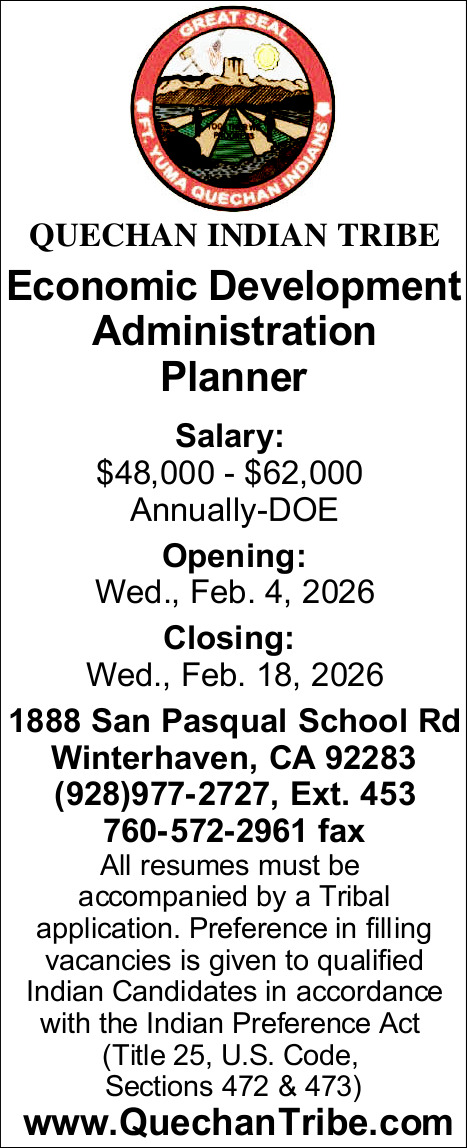 Feb 04, 2026. Quechan Indian Tribe Administration Jobs from Yuma Sun Jobs